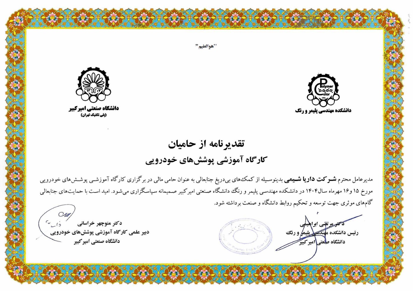 شرکت بازرگانی داریا شیمی آرا حامی طلایی کارگاه علمی تخصصی پوشش های سطح – پوشش های خودرویی ، به عنوان یکی از تامین کنندگان اصلی و واردکننده در این رویداد مهم حضور بهم رساند.